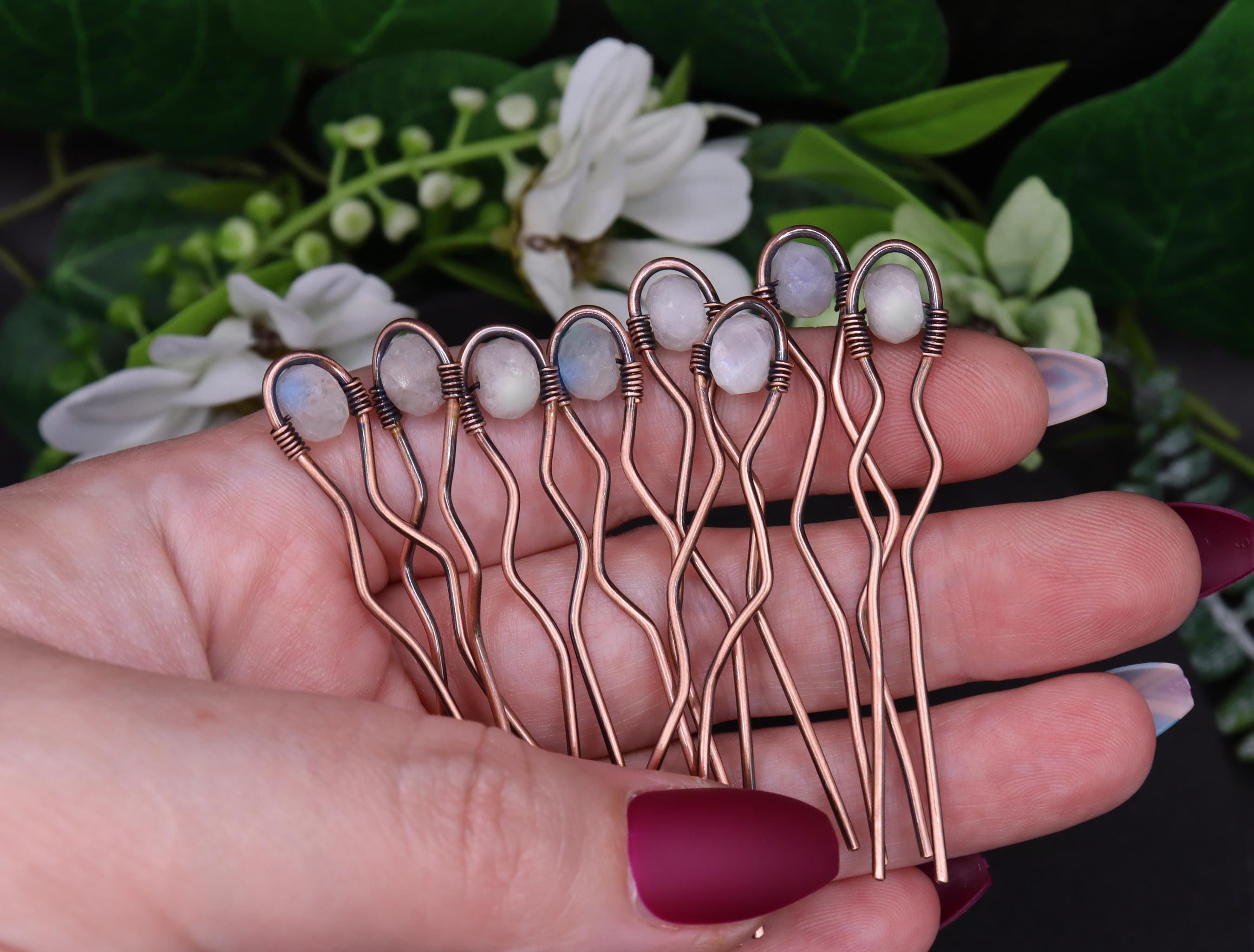 These handmade copper wire wrapped hair pins feature natural white Moonstone with a soft shimmer with white and hues of blue flash. Each pin carries a touch of lunar magic — subtle, enchanting, and perfect for everyday or ritual wear.